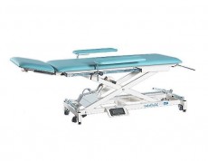 Угол наклона средней части ложа стола изменяется с помощью ступенчатой регулировки, угол наклона лицевой части - с помощью газового амортизатора. Рама стола комплектуется колесиками для легкого перемещения кушетки и регулировкой от раскачивания из-за неровности пола. Уровень высоты стола регулируется с помощью электропривода.