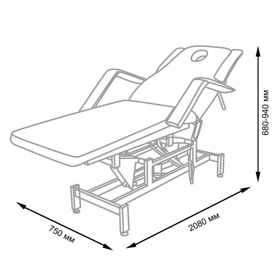 Комплектация: кушетка, подлокотники, съемная подушка, металлические элементы каркаса и основания, электропривод с двумя электромоторами и дистанционным пультом управления, махровый чехол.